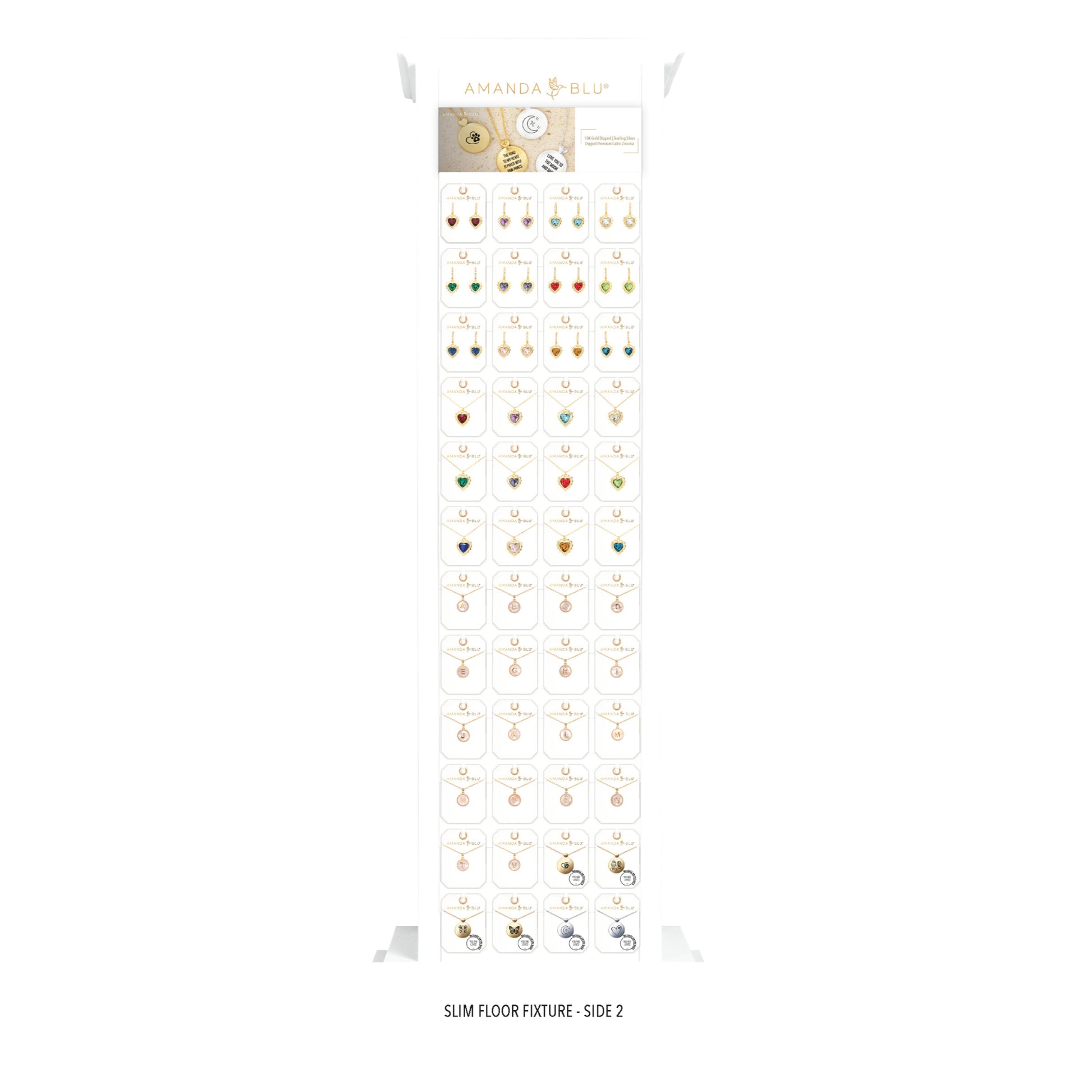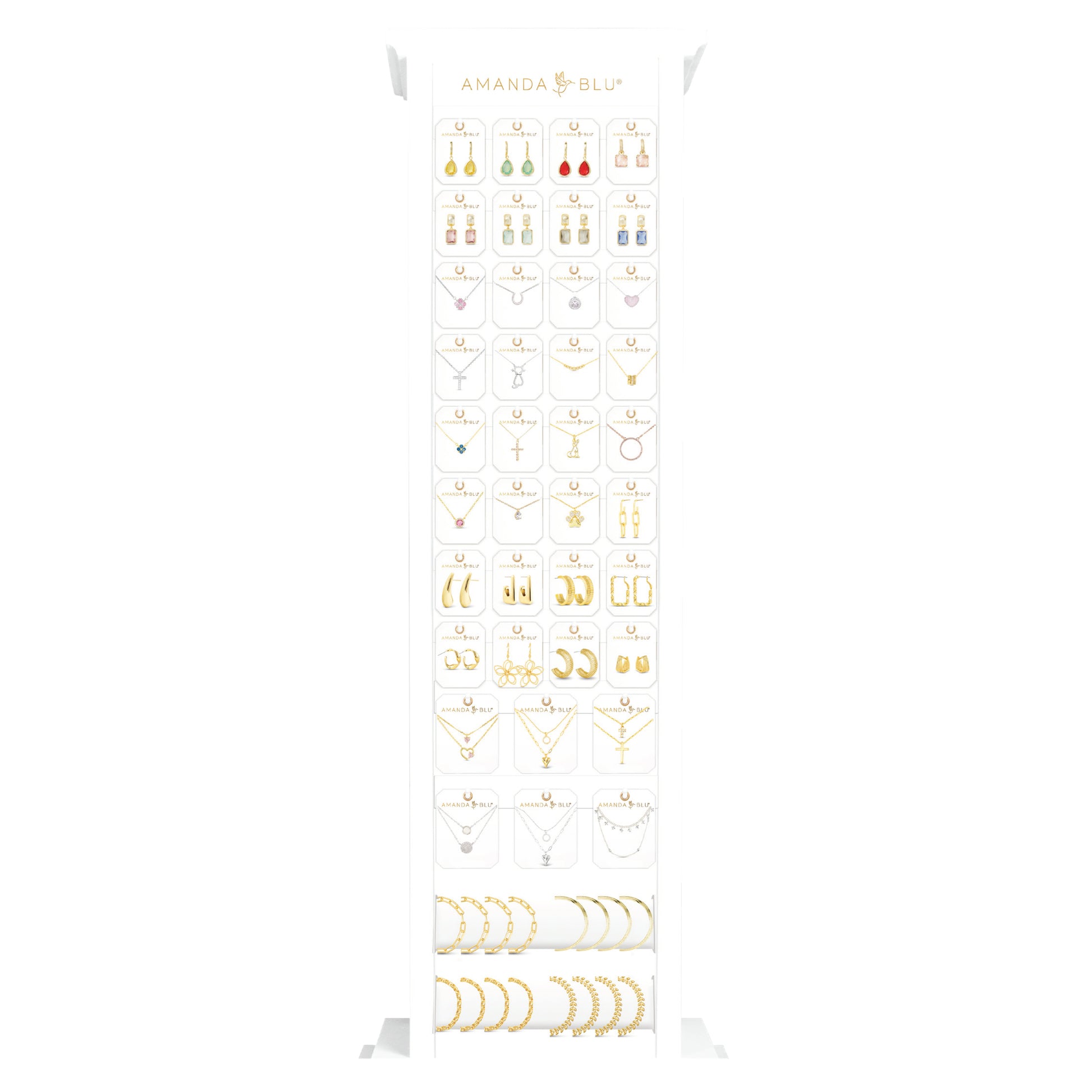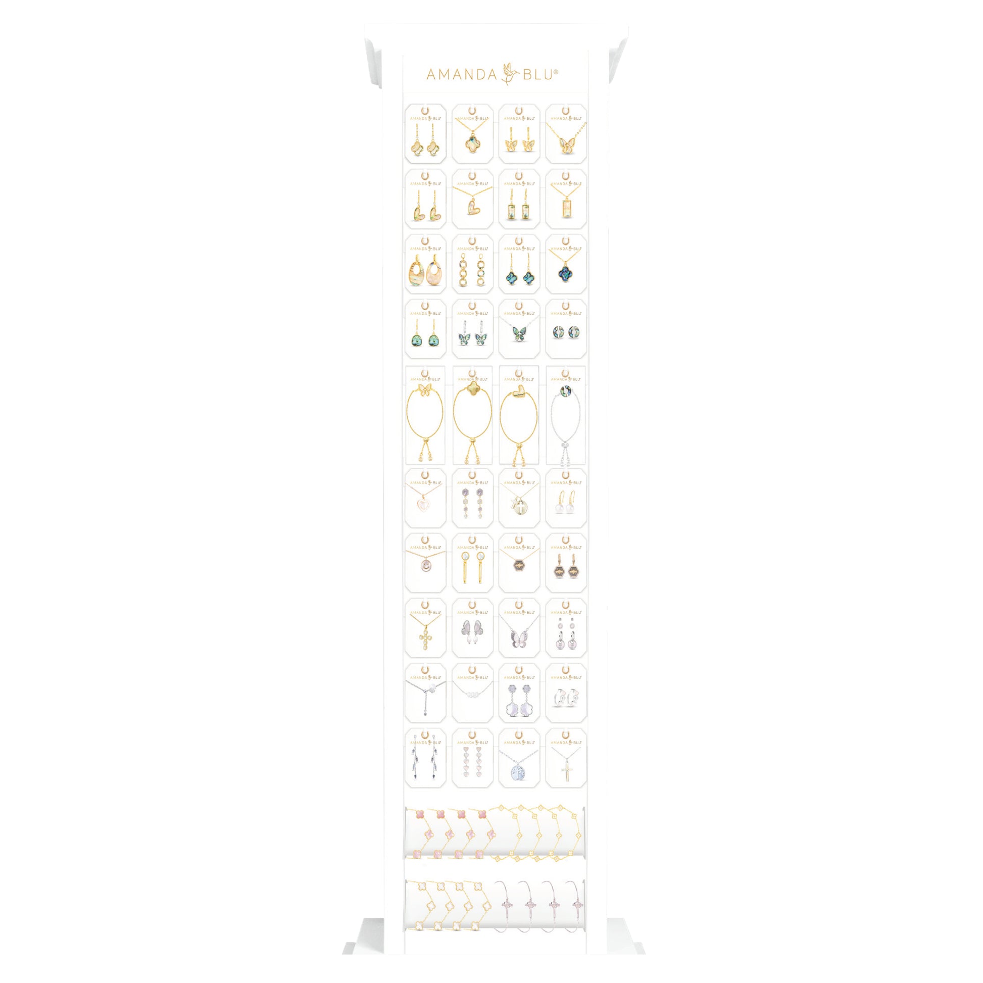 Transform your retail space with our Slim Floor Fixture White Display, a comprehensive merchandising solution from our exclusive, curated jewelry selection. This high-impact, turn-key display offers a premium shopping experience at scale, featuring a wide variety of pieces crafted from 18k Gold Dipped, Sterling Silver Dipped, Mother of Pearl, Abalone, and premium Cubic Zirconia.