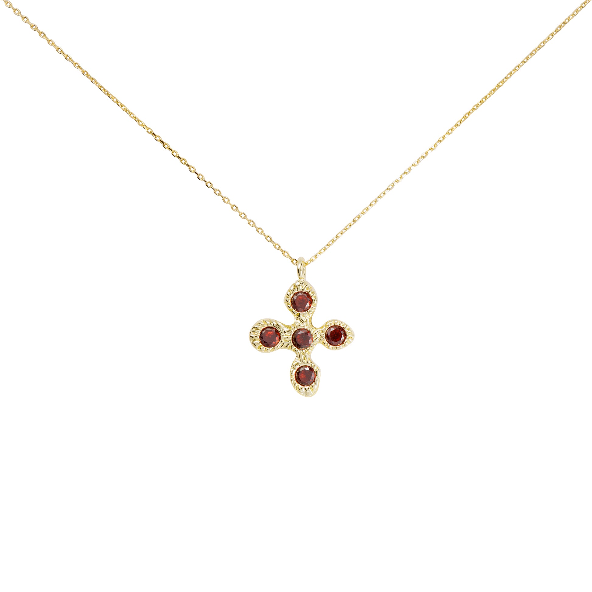 A bold gold cross featuring five radiant red stones for a pop of color and sparkle.