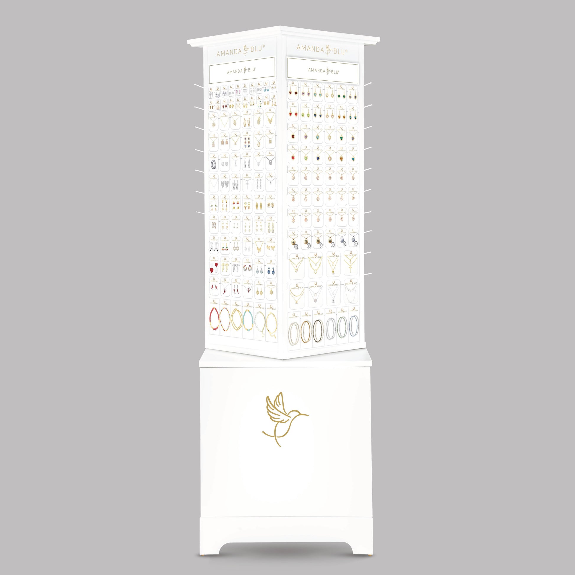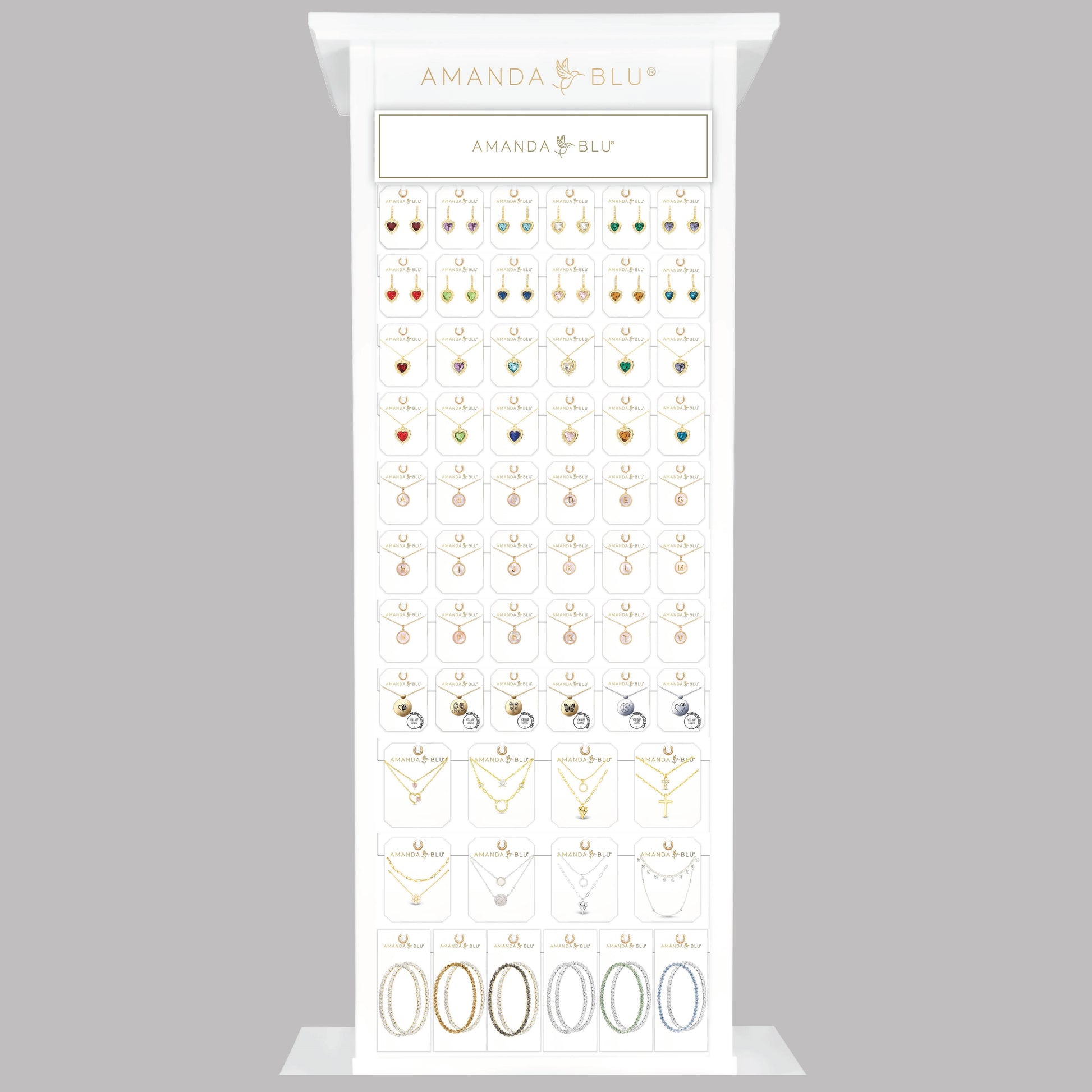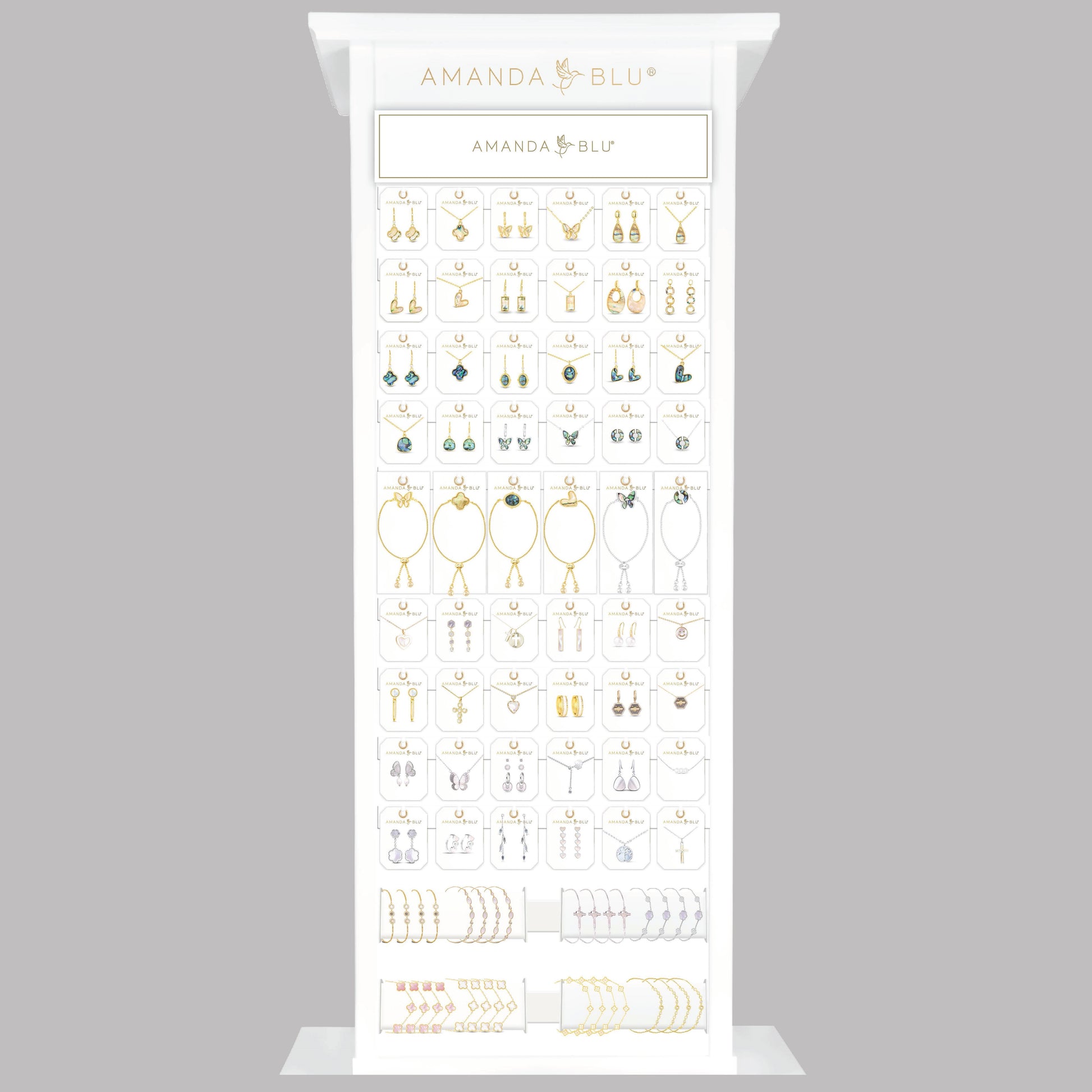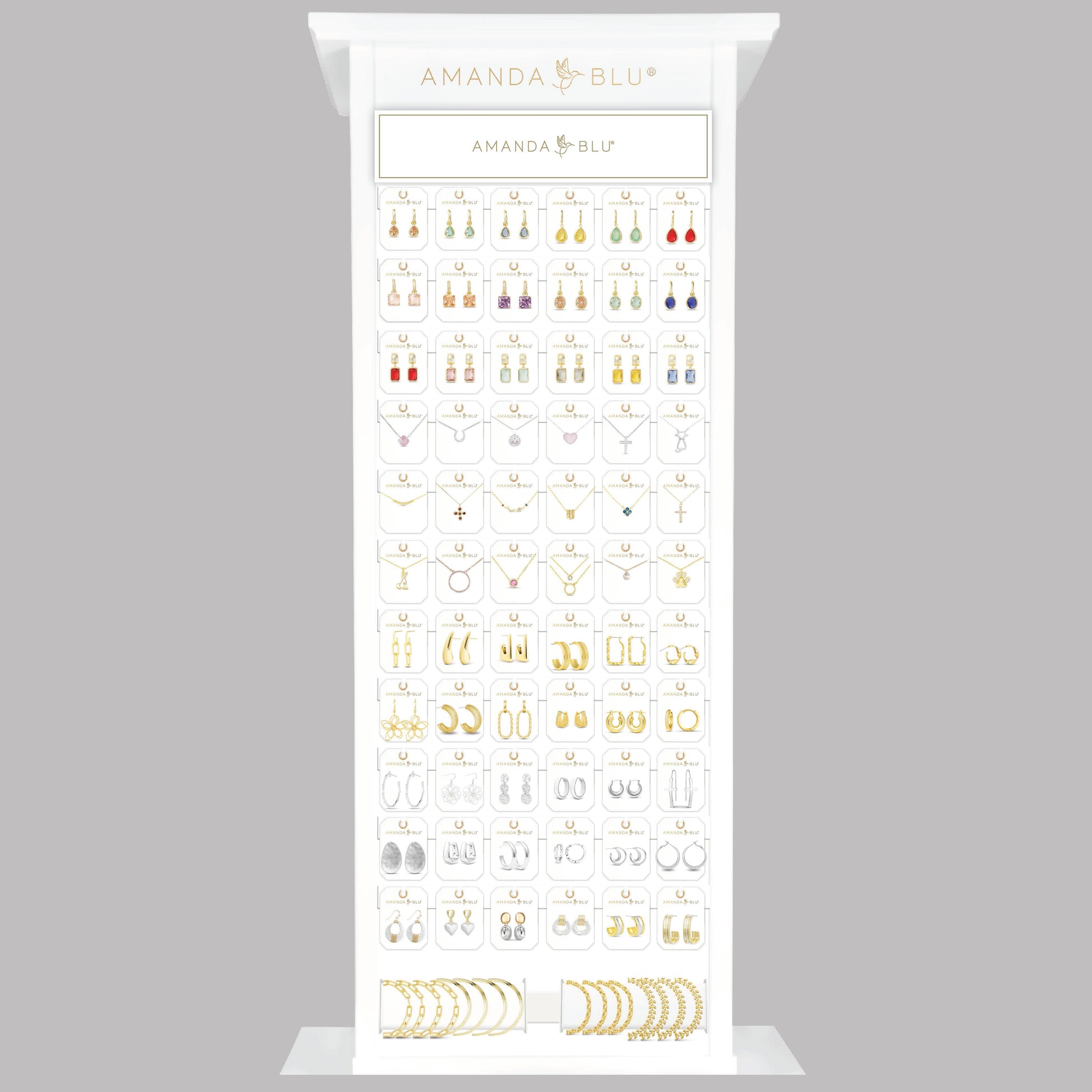 Transform your retail space with our Slim Floor Fixture White Display, a comprehensive merchandising solution from our exclusive, curated jewelry selection. This high-impact, turn-key display offers a premium shopping experience at scale, featuring a wide variety of pieces crafted from 18k Gold Dipped, Sterling Silver Dipped, Mother of Pearl, Abalone, and premium Cubic Zirconia.