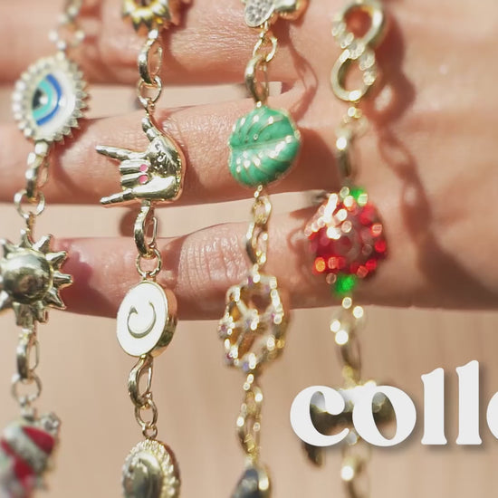 This exciting propriety charm program is available exclusively to DM retailers! Showcased on a rotating counter display with an eye-catching video header and magnetized try-on trays, this collection invites your customers to build personalized bracelets with luxe charms and accent chains that easily clip together with mini carabiner clasps. Made with hypoallergenic stainless steel and the highest quality PVD coating, these bracelets stay tarnish-free from shower to beach and everywhere in between.